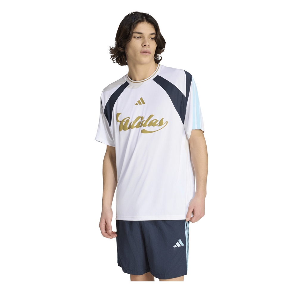 Der gerippte Rundhalsausschnitt und die auffälligen Einsätze sind von den Spielfeld-Klassikern inspiriert. Ein 3-Balken Logo und der große adidas Schriftzug auf der Brust unterstreichen die sportliche Dynamik.