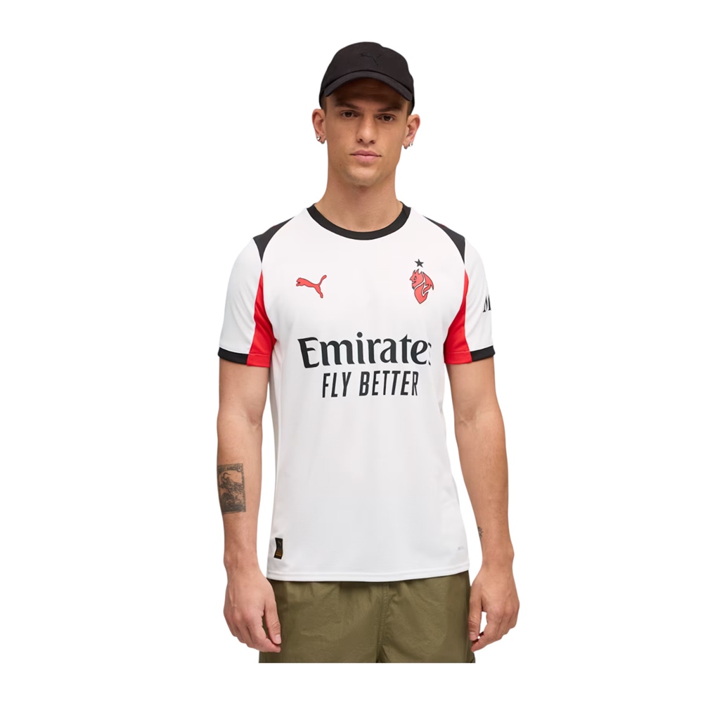 Das 25/26er Auswärtstrikot kombiniert klassisches Weiß mit feurigem Rot und schwarzen Akzenten